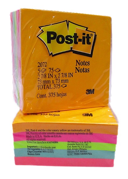 BLOCK DE NOTAS ADHESIVAS MEDIDA 76 MM X 76 MM (3″ X 3″) 5 COLORES NEON MODELO 2072 75 HOJAS POR PIEZA 3M POST-IT 70005251999